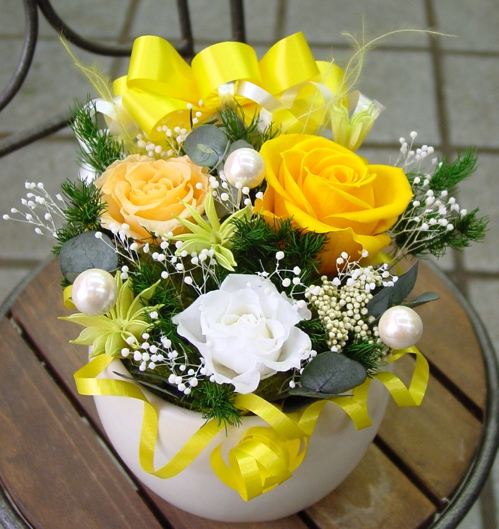 まぁるい器のプリザーブドフラワーアレンジ(黄色)です。